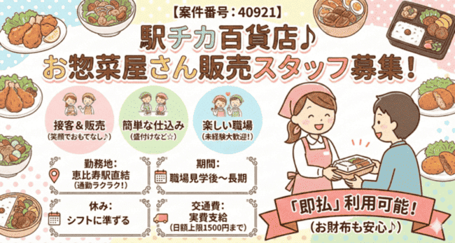 【時給1800円】百貨店の惣菜店での販売業務≪恵比寿駅≫