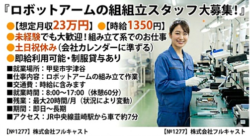 甲斐市【月収23万】即給あり!アーム組立にワクワク!